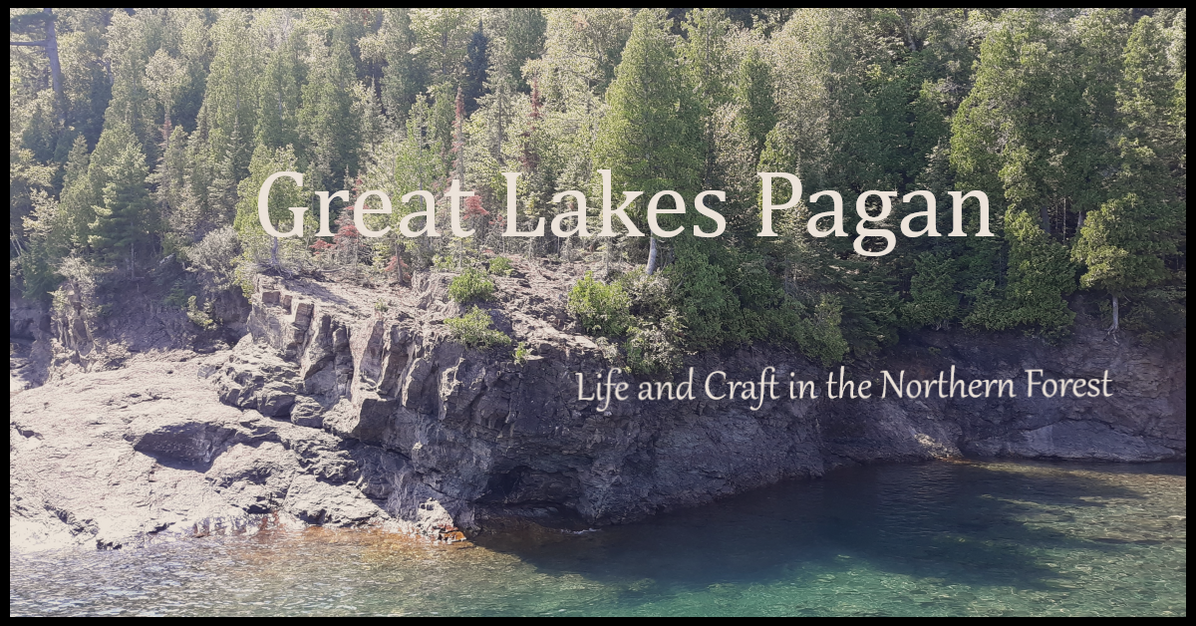 Devotional Polytheist. Hedge Witch. Queer. Fiber Artist. House Husband. Posts about Paganism and rural life in the Great Lakes region. (He/Him) Header is the cover for my blog titled 'Great Lakes Pagan: Life and Craft in the Northern Forest'. The words are imposed over a landscape photo of a lakeshore with pine-covered sandstone cliffs cut out in curving patterns due to erosion. Profile photo is me: a thin, clean-shaven brunet white guy with glasses wearing his signature grey knit hat.